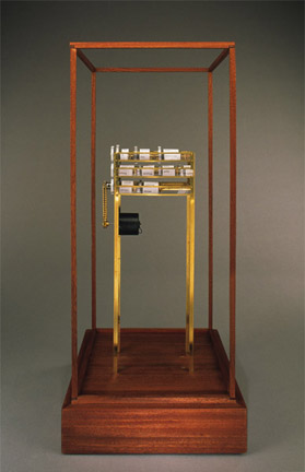 Haiku Machine 2002 mahogany, glass, brass, ink and paper on wood spools, fresnel lenses, electric motor 28” x 13” x 12 "
