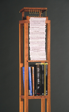 text-loom (from Rules & Regulations #1) 2003 mahogany, brass, thread, religious texts 58” x 14” x 16 "