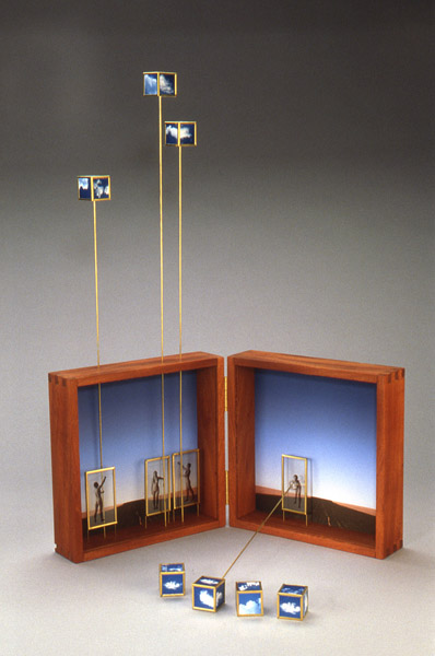 mahogany, brass, glass, plexiglas, color prints, b&w prints on transparencies