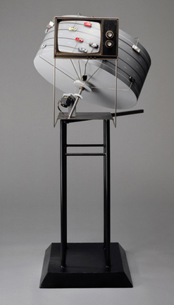 steel, wood, mdf, paint, toy cars, found TV frame, electric motor
