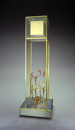 4 men Pursuing the Thick Golden Cube 1998 aluminum, gold, brass, bronze, glass, electric motor 29” x 9 ” x 9"