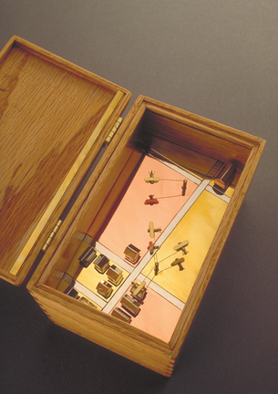 Barnstormer 1996 (additional set of 6, 1998) oak, glass, brass, nickel, copper, bronze, electric motor 3.5” x 3.5 ” x 3.5"