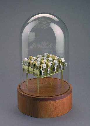 mahogany, glass bell jar, brass, aluminum, dice electric motor