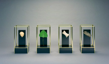 untitled (nature/grids 1-4) 2000 wood, paint, glass,found natural objects, fiber optic cable and electric lights each 14.5 ” x 7.5 ” x 6 "