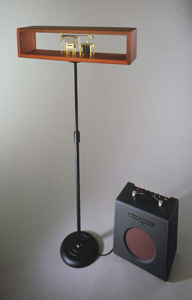 Proof #1 (stone) 2005 jarrah, glass, brass, steel, stone, steel file, microphone, guitar effects, amplifier 52” x 25 ” x 9"; amp & effects variable