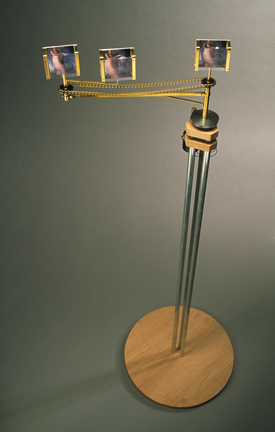 oak, aluminum, brass, color prints, fresnel lenses, electric motor